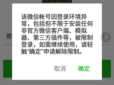 十、系統(tǒng)多次檢測(cè)到當(dāng)前設(shè)備安裝有非官方客戶端、模擬器或搶紅包插件。如繼續(xù)使用非官方軟件,通過當(dāng)前設(shè)備登錄的所有賬號(hào)都可能被封號(hào)。