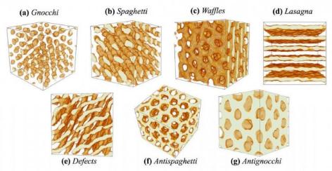 核通心粉就是其中一種物質(zhì)。當(dāng)恒星中致密的中子被擠壓并推向不同方向時,則會呈現(xiàn)出一系列的形狀,科學(xué)家們將它們跟不同種類的面條作對比。其中形成近乎圓形氣泡的被比作意大利團(tuán)子,形成長、細(xì)棒子的則被叫做意大利細(xì)面條。