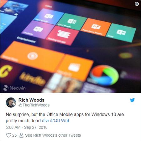 在外媒 Neowin 編輯 Rich Wood 于 Twitter 上爆料之后,有關微軟將要放棄 Office Mobile 應用的消息迅速發(fā)酵。他在推文中寫到:“毫不奇怪,但 Windows 10 Office Mobile 應用算是走到盡頭了”。他從一位參加了微軟 Ignite 2018 技術大會的消息人士處獲悉,其在會后立即與 Office 團隊進行了探討,后者透露該公司將把 Windows 10 Office Mobile 打入冷宮(被視為“遺留軟件”/ Legacy Software)。