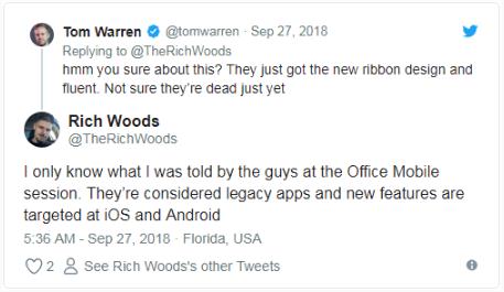 這位消息人士稱:“我在 Office Mobile 子會場被告知,它們已經被視為‘遺留軟件’,新功能將只面向 iOS 和 Android 作”。