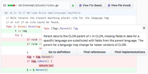 Sourcegraph 是一款能夠根據(jù)語義來把 Web 上的開源代碼編入索引的代碼搜索瀏覽工具。你可以從代碼倉庫和安裝包,甚至是函數(shù)里搜索代碼,同時也可以直接點擊被完全創(chuàng)建了鏈接的代碼來閱讀文檔、跳轉(zhuǎn)到變量定義或者馬上找到可用的 Demo??偠灾?,你可以在你的 Web 瀏覽器上完成這一切,而不需要配置任何編輯器。由 Sourcegraph 出品的這款 Chrome 插件,可以非常方便地瀏覽和搜索 GitHub 上的代碼,持跨倉庫(repository)搜索、跳轉(zhuǎn)到定義、查找引用等功能,宛若一個功能強大的 IDE。核心功能如跳轉(zhuǎn)到定義(Go-to-definition) —— 瀏覽文件或查看 pull 請求時,將鼠標(biāo)懸停在代碼上可以查看文檔提示,單擊即可跳轉(zhuǎn)到定義、查找引用或全文搜索。