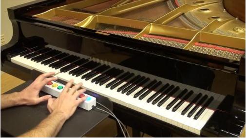 谷歌的這一靈感來源于音樂電子游戲《搖滾樂隊》和《吉他英雄》,其 Magenta 創(chuàng)意研究團隊在此基礎(chǔ)上進一步創(chuàng)作,創(chuàng)造了一個智能控制器“鋼琴精靈”。用戶敲擊按鍵時,它可以將其譯為使用所有 88 個鋼琴鍵而彈奏出的音樂。