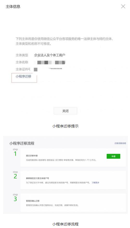 在小程序主體遷移功能開放之前,如果小程序主體有遷移需求,只能重新在新主體下再做一個小程序,然后通過在原有小程序上添加引導鏈接,引導用戶訪問新主體下的小程序。這種做法不僅麻煩,也過于笨重。更嚴重的問題是用戶流失。流失主要體現(xiàn)在兩個方面。我們都知道小程序無需關注,但也會有用戶留存。用戶訪問小程序,可以添加到我的小程序里,并出現(xiàn)在微信聊天主頁頂部的下拉菜單里。重新在新主體生成小程序后,老用戶訪問舊主體小程序,如果沒有注意到引導信息,或者覺得麻煩沒有點擊訪問,這就帶來了用戶流失。另一方面,小程序下都會對應用戶的Union ID,如果生成新主體,沒有保存便注銷了舊主體的小程序,原有小程序里的賬號、積分等用戶數(shù)據(jù)便會丟失,損失慘重。而且小程序具有名稱唯一性,想在新主體下重新注冊,便要先注銷舊主體小程序,這個時間空檔也還存在名稱被搶注的風險。