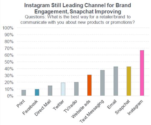Instagram 鞏固了其領(lǐng)先優(yōu)勢(shì),近 70% 的青少年表示他們更喜歡品牌就新品通過(guò) Instagram 與他們聯(lián)系。 Snapchat 在這項(xiàng)調(diào)查中排在電子郵件之前排名第二,比例僅超過(guò) 40%。