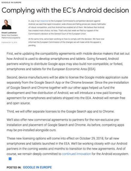 我們在 7 月對歐盟委員會針對 Android 的競爭決策的回應(yīng)中,表示快速創(chuàng)新,提供廣泛選擇和下降價格是強勁競爭的經(jīng)典手段,并且 Android 已經(jīng)啟用了這些手段。我們相信 Android 為消費者提供了更多選擇。因此,我們于上周向歐盟總法院提交了委員會決定的上訴。