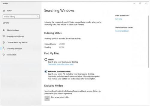 用戶(hù)啟用增強(qiáng)搜索模式后,Windows 10 將索引的不僅僅是放置在庫(kù)中的文件。這意味著系統(tǒng)會(huì)索引所有文件和文件夾以創(chuàng)建數(shù)據(jù)映射。索引過(guò)程可能需要 5 分鐘或更長(zhǎng)時(shí)間,因?yàn)樗耆Q于本地驅(qū)動(dòng)器上的文件數(shù)。但是,用戶(hù)可以從索引中排除路徑或位置以加快進(jìn)程。