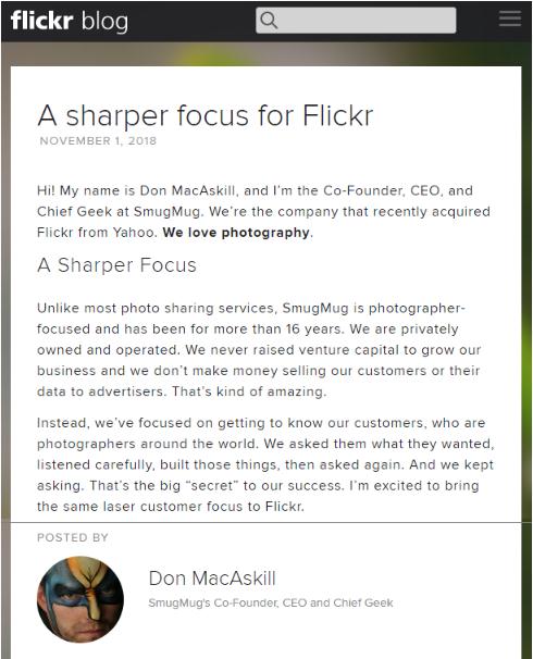 Don MacSkill 在最近的一篇博客文章中寫到:“經(jīng)歷了戰(zhàn)略起步之后,追逐成為熱門社交媒體的時代已經(jīng)過去,今后 Flickr 的戰(zhàn)略將主要面向攝影和攝影師”。