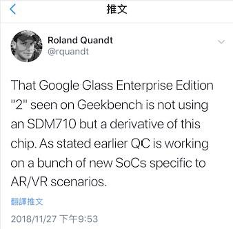 昨日晚間,Roland Quandt 在社交媒體上透露,在 GeekBench 跑分測試中現(xiàn)身的第二代企業(yè)版谷歌眼鏡的產(chǎn)品上,所使用的并非驍龍 710 芯片,而是一款高通專門針對 AR/VR 場景而設(shè)計的芯片。
