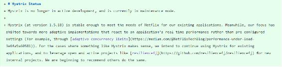 在十天前更新的 readme 文檔中,官方表示 1.5.18 版本的 Hystrix 已經(jīng)足夠穩(wěn)定,可以滿足 Netflix 現(xiàn)有應(yīng)用的需求,所以接下來其會把焦點轉(zhuǎn)向?qū)τ谧赃m應(yīng)的實現(xiàn),更多關(guān)注對應(yīng)用程序的實時性能做出響應(yīng)。Netflix 已有的應(yīng)用將繼續(xù)使用 Hystrix,而對于新應(yīng)用的熔斷需求,將采用其它項目實現(xiàn),Netflix 推薦了 Resilience4j。