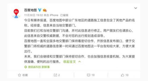 百度地圖稱,自己一直和全國多地交警部門保持著密切合作,開放信息發(fā)布接口,便于交警部門將權(quán)威的道路信息第一時間通過百度地圖這一平臺告知給大家,方便大家出行。未來,我們會繼續(xù)和交警部門保持密切合作,也會加強信息核查機制,為大家提供準確、便利的出行服務。