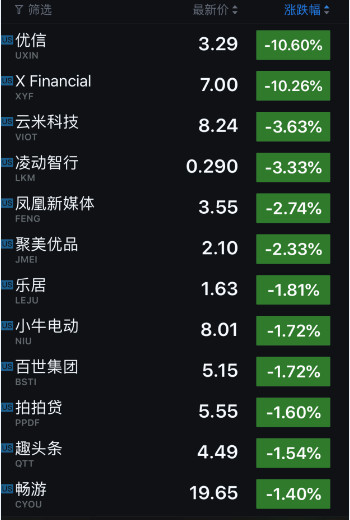 另一方面,跌幅較大的公司包括:優(yōu)信(跌 10.60%)、小贏科技(跌 10.26%)、云米科技(跌 3.63%)、凌動智行(跌 3.33%)、鳳凰新媒體(跌 2.74%)、聚美優(yōu)品(跌 2.33%)。