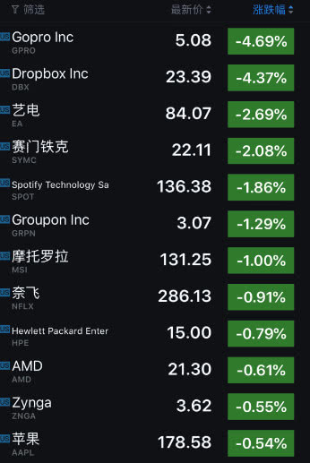 另一方面,跌幅較大的公司包括:Gopro(跌 4.69%)、Dropbox(跌 4.37%)、藝電(跌 2.69%)、賽門鐵克(跌 2.08%)、Spotify(跌 1.86%)、Groupon(跌 1.29%)、魔頭羅拉系統(tǒng)(跌 1.00%)。