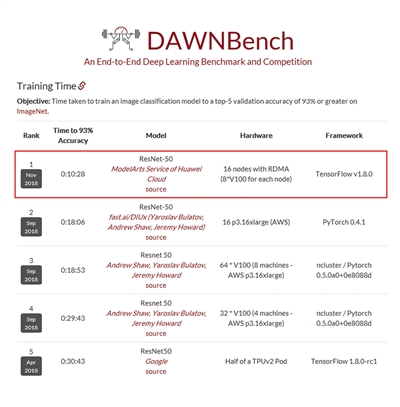 近日,斯坦福大學發(fā)布了 DAWNBenchmark 的最新成績,在圖像識別(ResNet50-on-ImageNet,93% 以上精度)的總訓練時間上,華為云 ModelArts 排名世界第一,僅需 10 分 28 秒,比第二名提升近 44%。成績證明,華為云 ModelArts 實現(xiàn)了更低成本、更快速度、更極致的體驗。