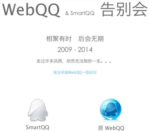 到 2014 年 9 月,WebQQ 官網(wǎng)掛出公告,顯示“相聚有時,后會無期”,“2009-2014”,并提示網(wǎng)友“留言祝福 WebQQ 一路走好”。