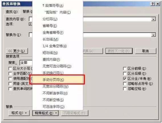 使用Word快捷鍵“Ctrl + H”打開查找替換窗口,然后單擊“高級”或“更多”在“特殊格式”中選擇“手動分頁符”