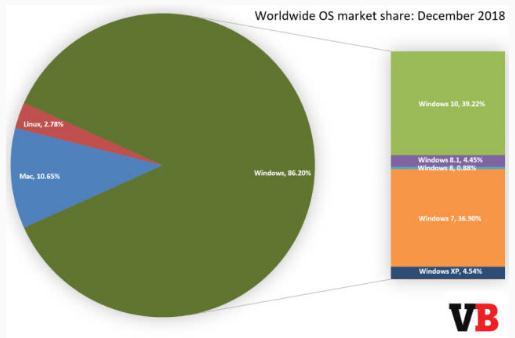 在 2018 年 12 月,Windows 的市場份額整體下滑了 0.83 個百分點,下滑到了 86.20%。相對而言,在 2017 年 12 月,Windows 的市場份額是 88.51%。