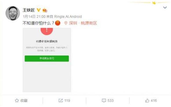 昨日晚間王欣發(fā)布微博稱(chēng):不知道你在怕什么?并配上一張無(wú)法正常訪問(wèn),微信提示網(wǎng)頁(yè)包含不安全內(nèi)容,被多人投訴的圖片。隨后王欣又發(fā)微博稱(chēng),騰訊大王卡短信也封了馬桶!