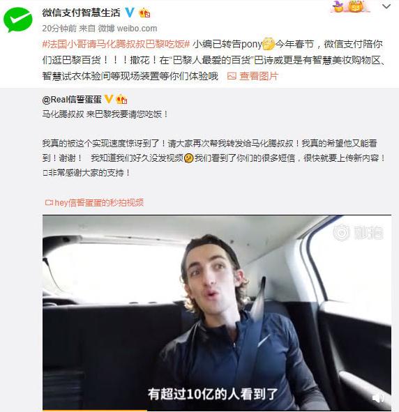 1 月 24 日消息,去年一個(gè)法國小哥@Real 信誓蛋蛋的視頻在微博上刷屏,該法國小哥希望微信支付能去拯救落后的法國。今天他再發(fā)微博稱,法國現(xiàn)在已能實(shí)現(xiàn)微信支付,還表示如果馬化騰來巴黎要請他吃飯!