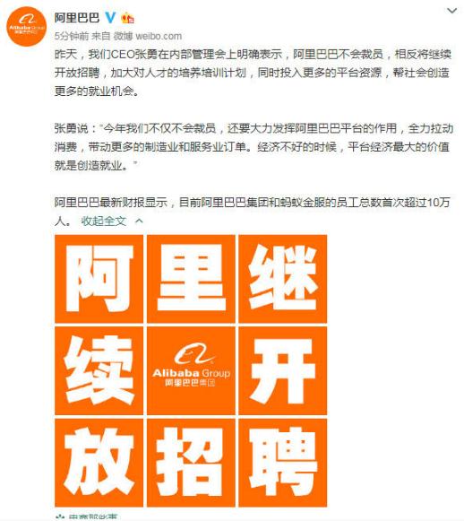 2 月 22 日消息,據(jù)阿里巴巴官方微博透露,昨日,阿里巴巴集團(tuán) CEO 張勇在內(nèi)部管理會(huì)上明確表示,阿里巴巴不會(huì)裁員,相反將繼續(xù)開(kāi)放招聘,加大對(duì)人才的培養(yǎng)培訓(xùn)計(jì)劃,同時(shí)投入更多的平臺(tái)資源,幫社會(huì)創(chuàng)造更多的就業(yè)機(jī)會(huì)。