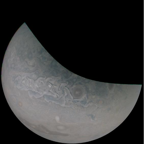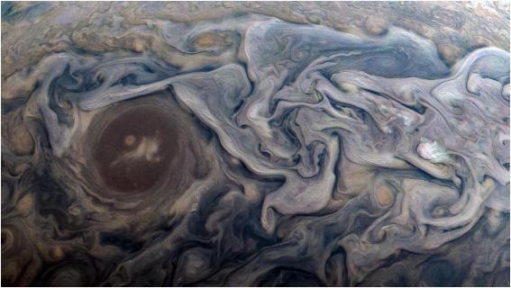當(dāng) Juno 在木星北半球漂移時,上面的圖片被機載 JunoCam 成像儀拍下來。圖片左側(cè)的大褐色斑點位于被稱為 Jet N6 的區(qū)域的旋轉(zhuǎn)氣流中。