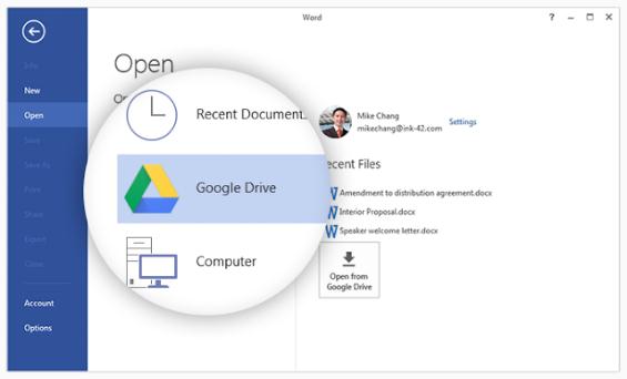 隨著 Google Drive File 系統(tǒng)的新插件開始發(fā)揮作用,用戶將能夠保存和打開 Google Drive 文件,而無需使用 Office 插件提供的界面,常規(guī)菜單將可以直接調(diào)用 GDrive 中的文檔。