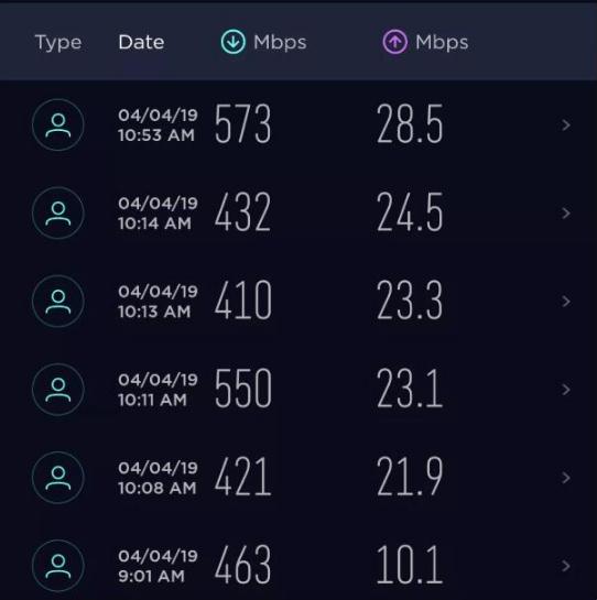 Welch 用的是摩托羅拉的 5G 手機 Moto Mod。他說,在有 5G 信號的地方,數(shù)據(jù)速度比 Verizon 的 4G LTE 網(wǎng)絡(luò)快得多,平均在 400 到接近 600Mbps,幾乎是他的 iPhone XS Max 手機的十倍。但上傳速度比預(yù)計的慢,有些摩托羅拉員工告訴他,他們自己測試時還曾經(jīng)低到接近 60Mbps。以下是 Welch 展示的測試網(wǎng)速圖。