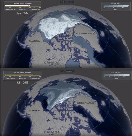 變化最大的主要是多年冰的面積:1984年有超310萬平方公里的面積被4年以上冰覆蓋,如今僅有11.6萬平方公里,意味著35年里減少了95%。