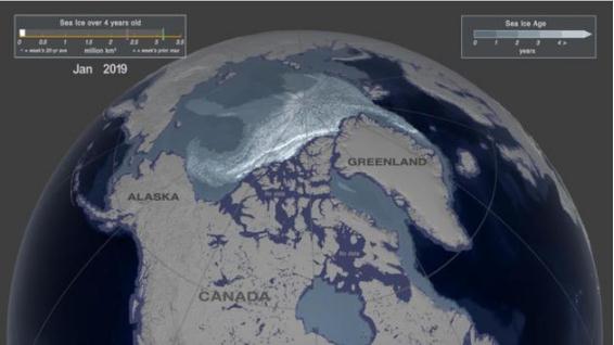 這一切都說明,氣候變化已經(jīng)是板上釘釘?shù)氖聦?。它并不是幾十年后子孫后人解決的問題,而是已經(jīng)迫在眉睫、時不我待了。否認氣候變化的人常常將冰蓋融化等現(xiàn)象的季節(jié)性變化當作“氣候變化并非人為、而是天意”的證據(jù)。但事實并非如此。從多年冰的變化趨勢可以看出,雖然曲線中有自然因素導致的上下起伏,這種整體變化在 NASA 發(fā)布的視頻中體現(xiàn)得尤為明顯。視頻中的畫面為地球最北端,周復(fù)一周、年復(fù)一年,北極海冰的面積也在隨季節(jié)變遷不斷變動、時多時少。視頻中冰蓋的顏色代表其存在時長,俄羅斯和加拿大地區(qū)的深藍色代表每年冬天形成、春天融化的新冰蓋,北極圈內(nèi)的白色則代表存在時長超過四年的陳舊冰蓋,介于兩者之間的淺藍色則代表時長一年、兩年或三年的冰蓋。