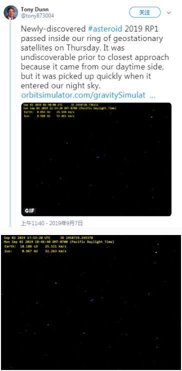 業(yè)余天文學(xué)家 Tony Dunn 在 Twitter 上報道說,小行星 2019 RP1“在最接近之前是不可發(fā)現(xiàn)的,因為它來自我們白天的一面,但是當(dāng)它進入我們的夜空時它被迅速發(fā)現(xiàn)。”