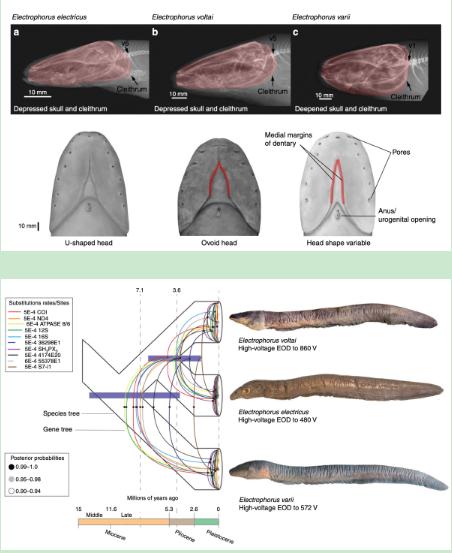 在《自然通訊》發(fā)表的研究中,美國(guó)華盛頓哥倫比亞特區(qū)史密森尼博物館的研究人員檢查了來(lái)自亞馬遜地區(qū)的107個(gè)電鰻樣本,根據(jù)基因、形態(tài)、地理分布等要素得出結(jié)論:亞馬遜盆地的電鰻屬于三種不同的物種,在數(shù)百萬(wàn)年前從一個(gè)共同祖先進(jìn)化而來(lái)。