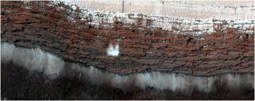 根據(jù)美國國家航空航天局(NASA)的圖像數(shù)據(jù),上圖所示的塵埃“爆炸”是由于冰和巖石在 1600 多英尺高的懸崖上翻滾而造成的。航天局解釋說,在火星這一部分的每個(gè)春季,一堆巖石沐浴在陽光下,會(huì)使其中的冰變暖到足以使其不穩(wěn)定,導(dǎo)致雪崩。大塊的冰和巖石混合物崩塌會(huì)掀起灰塵,產(chǎn)生圖像所顯示的“爆炸”。