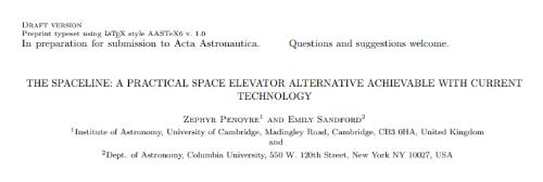 這篇論文的兩位共同作者 Penoyre 和 Sandford 都是哥倫比亞大學(xué)天文學(xué)研究生,他們將這個(gè)月球空間電梯稱為 Spaceline。其中心環(huán)節(jié)是一條長(zhǎng)達(dá) 20 萬(wàn)英里(32 萬(wàn)公里)的線纜,一頭固定在月球上,另一頭指向地球上方,可能位于距離地球 27000 英里的軌道上。(由于月球的相對(duì)運(yùn)動(dòng),線纜無(wú)法固定在地球表面。)