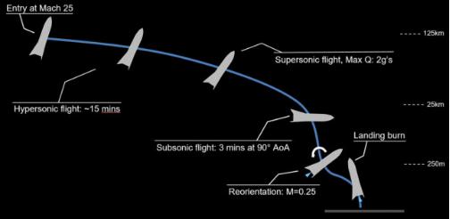 在某種程度上,星際飛船進(jìn)入大氣層的情況實(shí)際上與美國宇航局現(xiàn)已退役的航天飛機(jī)非常相似,后者從進(jìn)入大氣層燃燒到著陸大約需要 30 分鐘。根據(jù)上面的信息圖,看起來星際飛船從軌道到著陸大約需要 20 分鐘,這是因?yàn)橐坏┧_(dá)到較慢的速度,就會采用截然不同的方法著陸。