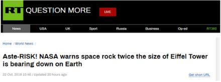 RT稱,雖然該小行星撞擊地球的風(fēng)險(xiǎn)很低,但是也有很小幾率發(fā)生“雅科夫斯基”效應(yīng),即太陽(yáng)光的熱能會(huì)引導(dǎo)小行星偏離其當(dāng)前軌道,這也許會(huì)使這顆小行星更靠近地球。