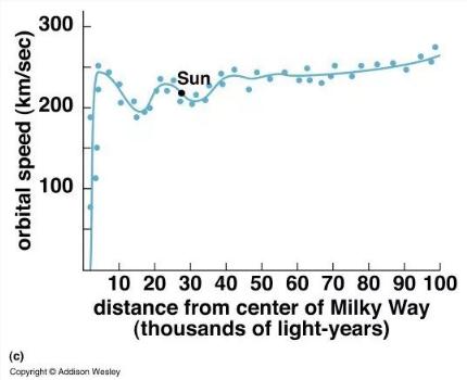 銀河系的旋轉(zhuǎn)速度曲線。與恒星系等系統(tǒng)不同,在星系中,除了非常靠近核心的區(qū)域外,任一半徑上的旋轉(zhuǎn)線速度是相當(dāng)?shù)摹D中橫坐標(biāo)是到銀心的距離(單位:光年),縱坐標(biāo)是旋轉(zhuǎn)線速度(單位:千米/秒)。Credit: Addison Wesley/University of Arizona