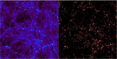 宇宙在第 30 億年左右時的暗物質(zhì)分布,由星系形成的數(shù)值模型給出。Credit: VIRGO Consortium/Alexandre Amblard/ESA