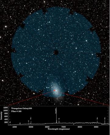 暗能量光譜儀位于亞利桑那州基特峰國家天文臺,它被安裝在尼古拉斯·梅奧爾望遠鏡上。據(jù)介紹,暗能量光譜儀擁有 5000 只“眼睛”,每只“眼睛”中都有專門制作的光纖,它們可收集來自遙遠宇宙的信息。