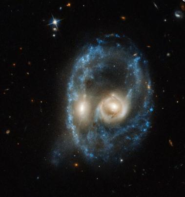 這個星系被稱為 Arp-Madore 2026-424,它位于 7.04 億光年以外。正面碰撞導致產(chǎn)生了異常的環(huán)形形狀。歐空局(ESA)表示說: “環(huán)狀星系很罕見,只有幾百個存在于我們更大的宇宙社區(qū)。” NASA 和 ESA 共同運營哈勃望遠鏡。