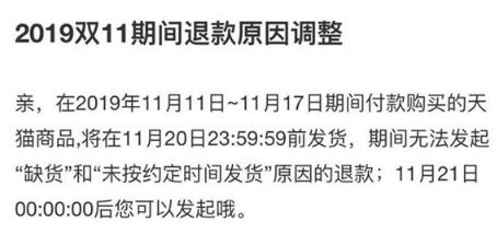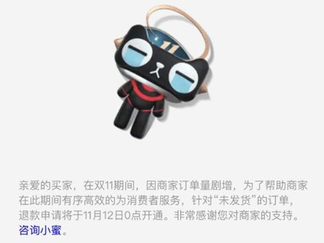 此外,由于太過火爆,雙十一當(dāng)天只能買不能退。據(jù)天貓?zhí)詫毠俜焦?,雙 11 期間商家訂單量激增,為了幫助商家在此期間有序高效的為消費者服務(wù),針對“未發(fā)貨”訂單,退款申請將于 11 月 12 日 0 點開通。