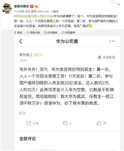11 月 11 日晚間,針對網傳華為雙 11 發(fā) 20 億元獎金的消息,華為內部員工回復騰訊科技稱:“全員發(fā)放一個月工資的陽光普照獎,20 億的獎金不清楚,本人未收到相關郵件。”
