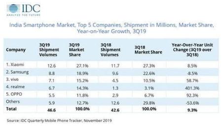 中國(guó)小米以27.1%的市場(chǎng)份額繼續(xù)保持其第一的位置,緊隨其后的是三星電子,該公司獲得了18.9%的份額,三季度三星在印度銷售了880萬(wàn)部智能手機(jī),銷量下滑了8.5%。小米和三星電子之間的份額差距在擴(kuò)大。
