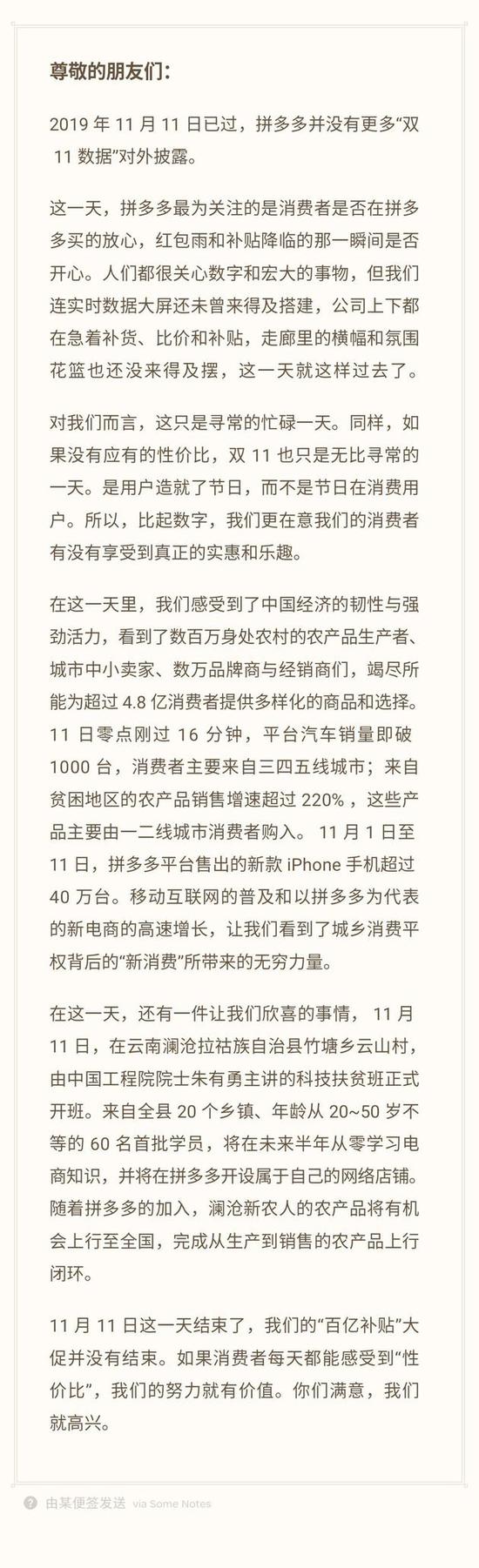 拼多多稱(chēng),“人們都很關(guān)心數(shù)字和宏大的事物,但我們連實(shí)時(shí)數(shù)據(jù)大屏還未曾來(lái)得及搭建,公司上下都在急著補(bǔ)貨、比價(jià)和補(bǔ)貼,走廊里的橫幅和氛圍花籃也還沒(méi)來(lái)得及擺,這一天就這樣過(guò)去了。”