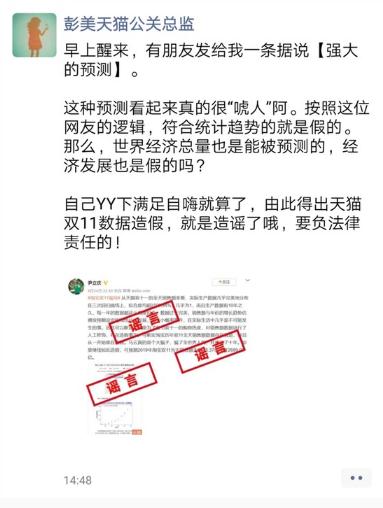 針對(duì)網(wǎng)友的質(zhì)疑,天貓公關(guān)總監(jiān)回應(yīng)表示,“按照網(wǎng)友的邏輯,符合統(tǒng)計(jì)趨勢的就是假的。那么,世界經(jīng)濟(jì)總量也是能被預(yù)測的,經(jīng)濟(jì)發(fā)展也是假的嗎?自己 YY 下滿足自嗨就算了,由此得出天貓雙 11 數(shù)據(jù)造假,就是造謠了哦,要負(fù)法律責(zé)任的!”