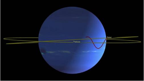 雖然兩顆衛(wèi)星的軌道相對較近,但它們的不同軌道使彼此相距超過約 2200 英里。那是因為以更快的速度運行的 Naiad 被鎖定為一種波動的運動,以確保兩顆衛(wèi)星永遠不會“偶遇”。無論兩顆衛(wèi)星完成其宿主行星軌道的次數(shù)多少,其模式都保持不變,Thalassa 在其軌道上平穩(wěn)運行,隨著 Naiad 的軌道呈鋸齒形,在其在姊妹衛(wèi)星的軌道上方或下方運行。