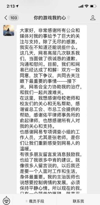 這幾天,網(wǎng)易高層幾次聯(lián)系我們,當面做了很誠懇的道歉、溝通和慰問。目前,我們和網(wǎng)易已經(jīng)達成了和解:雙方一致同意,放下爭議,共同去關(guān)注眼下最重要的事情-----接下來,網(wǎng)易會全力協(xié)助我的治療,和我們一起共渡難關(guān)。