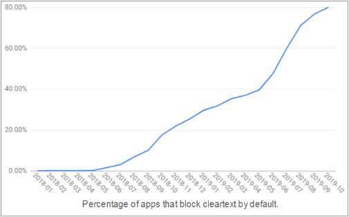 谷歌方面表示,截至 2019 年 10 月,五分之四(80%)可通過官方 Play 商店下載的 Android 應用程序正在使用 HTTPS 加密各自的網(wǎng)絡流量。而對于直接針對 Android 9 的應用,該數(shù)字甚至更高,達到 90%。這意味著進入或離開這些應用程序之一的流量是經(jīng)過加密的,第三方無法攔截或讀取。