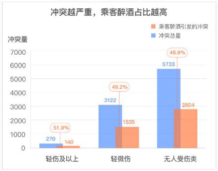 報(bào)告顯示,在越嚴(yán)重的沖突中,乘客醉酒占比越高。2019 年1-3 季度,有人受輕傷及以上的沖突投訴中,由醉酒引發(fā)的占比 51.9%;有人受輕微刮傷的沖突投訴中,由醉酒引發(fā)的占比 49.2%;言語(yǔ)沖突投訴中,由醉酒引發(fā)的占比 48.9%。