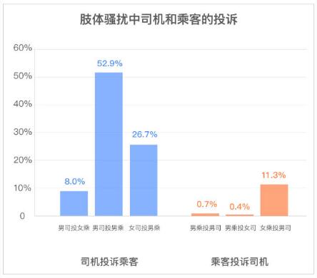 乘客醉酒乘車也可能導(dǎo)致言語(yǔ)或肢體類性騷擾投訴,其中,大部分是言語(yǔ)騷擾投訴,但是在少量的肢體騷擾投訴中,司機(jī)投訴乘客占比 87.6%,乘客投訴司機(jī)占比 12.4%。值得注意的是,男司機(jī)投訴男乘客肢體騷擾的比例占 52.9%。