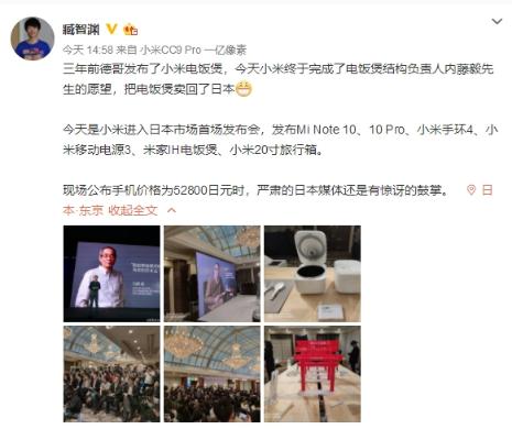 小米集團(tuán)國(guó)際部總裁、CFO 周受資表示:“小米終于把電飯煲賣回了日本!……小米將為日本市場(chǎng)帶來(lái)更多感動(dòng)人心,價(jià)格厚道的好產(chǎn)品!”