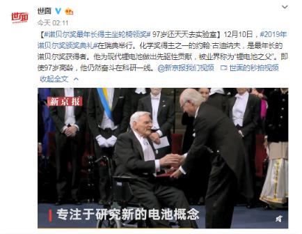 現(xiàn)場(chǎng)出現(xiàn)令人為之動(dòng)容一幕,現(xiàn)年97歲的約翰·B·古迪納夫(John B. Goodenough)坐著輪椅上臺(tái)領(lǐng)取化學(xué)獎(jiǎng)。